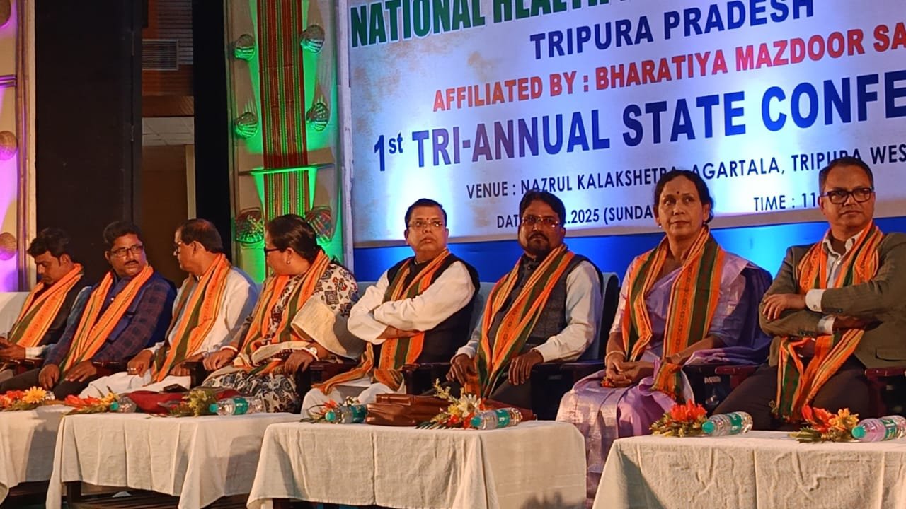 Among others present at the conference were NHM Workers’ Union General Secretary Piyush Bhowmik, NHM Assistant Mission Director Nupur Debbarma, and Bharatiya Mazdoor Sangh (BMS) State President Debashree Kalai, along with several senior officials, union leaders, and delegates from different parts of Tripura.