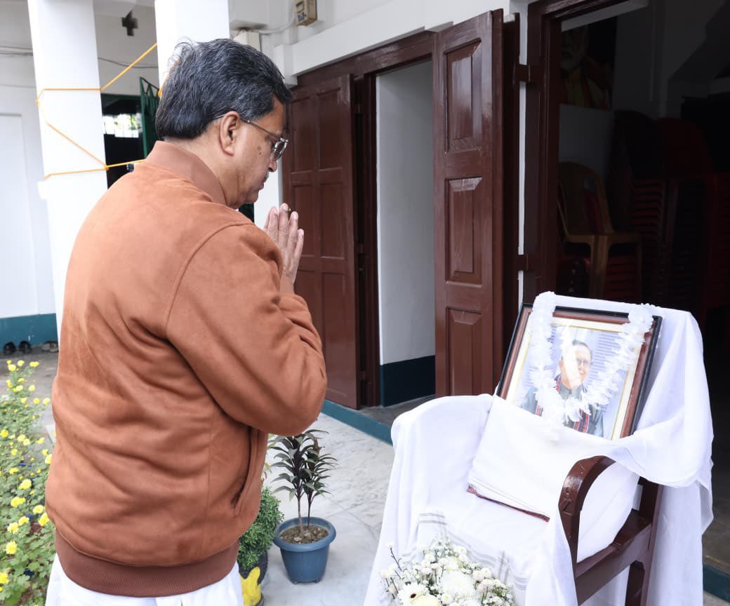 Chief Minister Dr Manik Saha on Sunday visited the Dharmanagar residence of the late Speaker of the Tripura Legislative Assembly, Bishwabandhu Sen, to pay his last respects. The Chief Minister offered floral tributes and expressed his deep condolences to the bereaved family members.Dr Saha remembered the late Speaker as a dedicated public servant whose contributions to the Tripura Legislative Assembly and to the overall development of Dharmanagar were significant and enduring. He said Bishwabandhu Sen’s commitment to public welfare and his service to the people would always be remembered with respect and gratitude.