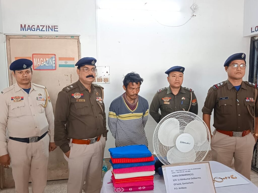 East Agartala Police Station have solved two separate theft cases and arrested multiple accused persons, successfully recovering stolen household items and gold ornaments.According to police, on Monday at around 2 PM, Moumita Debbarma was having lunch in the dining room of her residence at Palace Compound when a thief entered the house and stole several valuable items, including a table fan. After a complaint was lodged, police analyzed CCTV footage and identified the accused. Kulai resident Suraj Debbarma was detained, and the stolen items were later recovered from the Katakhal area. The accused was produced before the court and has been remanded to two days of police custody.In another case, gold ornaments were stolen from a house in the Nayanniamura area. The house owner, Bapan Pal, reported that two painters had worked at his residence for four days earlier this month. On January 16, while preparing for a family wedding, the family discovered that the gold ornaments were missing. Following the complaint, police detained two suspects, identified as Sanjay Sharma and Pratap Das, both residents of Charipara. During interrogation, the stolen gold ornaments were recovered from a jewellery shop. The shop owner, Bimal Rudra Pal, was also arrested in connection with the case.