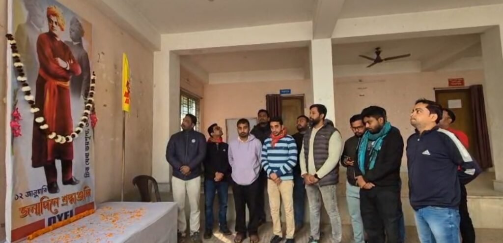 Swami Vivekananda’s 164th birth anniversary was observed with reverence at the Students and Youth Bhavan at Mela Ground in Agartala on Sunday. Leaders and members of various organisations assembled at the venue and paid floral tributes to the portrait of Swami Vivekananda.Speaking on the occasion, the speakers reflected on the life, philosophy and teachings of Swami Vivekananda, highlighting his vision of nation-building and his emphasis on the empowerment of youth. They said that Swamiji’s thoughts and ideals continue to inspire society and are especially relevant for the younger generation in guiding the nation towards progress, enlightenment and unity.